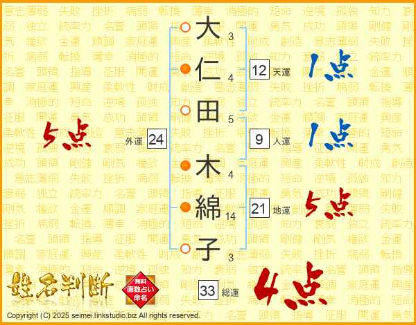 大仁田木綿子さんの総運は33画の4点!