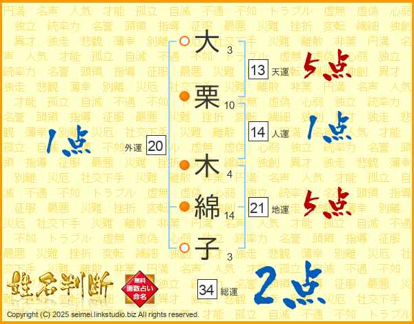 大(3画)栗(10画) 木(4画)綿(14画)子(3画)