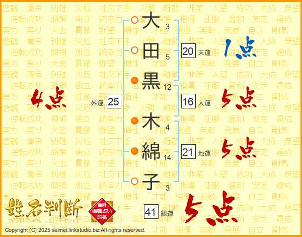 大田黒木綿子さんの総運は41画の5点!