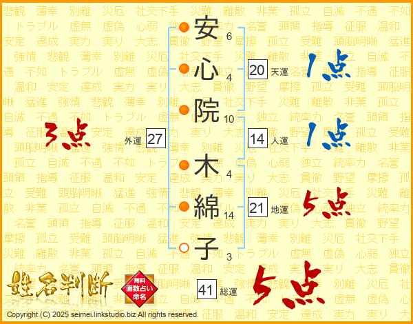 安(6画)心(4画)院(10画) 木(4画)綿(14画)子(3画)