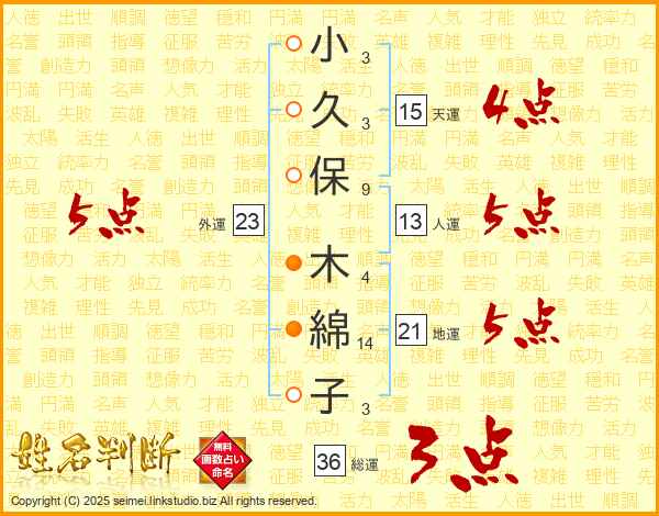 小(3画)久(3画)保(9画) 木(4画)綿(14画)子(3画)