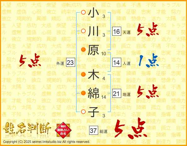 小(3画)川(3画)原(10画) 木(4画)綿(14画)子(3画)