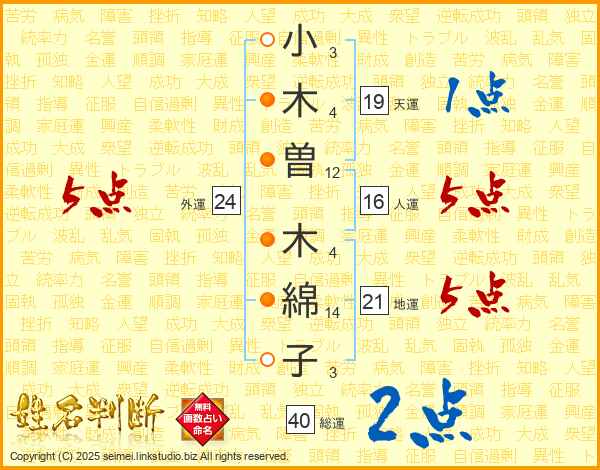 小(3画)木(4画)曽(12画) 木(4画)綿(14画)子(3画)