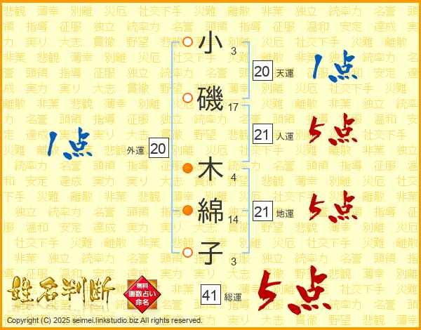 小磯木綿子さんの地運は21画の5点!