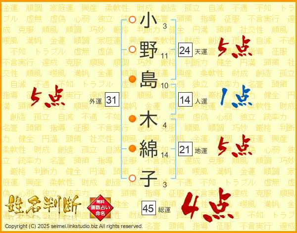 小(3画)野(11画)島(10画) 木(4画)綿(14画)子(3画)