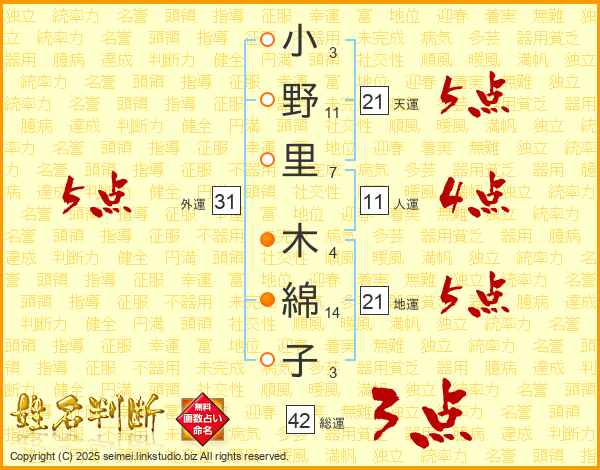 小野里木綿子さんの外運は31画の5点!