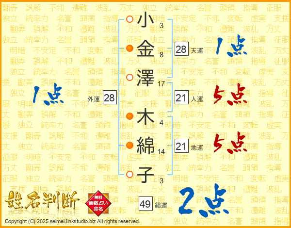 小(3画)金(8画)澤(17画) 木(4画)綿(14画)子(3画)