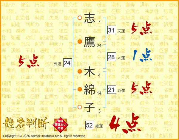 志鷹木綿子さんの総運は52画の4点!