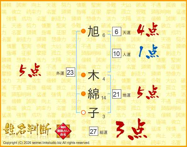 旭(6画) 木(4画)綿(14画)子(3画)