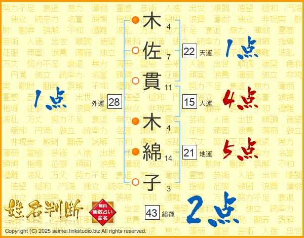 木佐貫木綿子さんの総運は43画の2点!