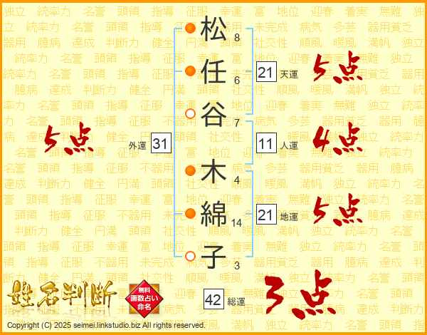 松(8画)任(6画)谷(7画) 木(4画)綿(14画)子(3画)