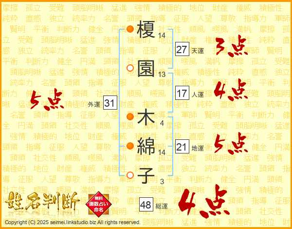 榎(14画)園(13画) 木(4画)綿(14画)子(3画)