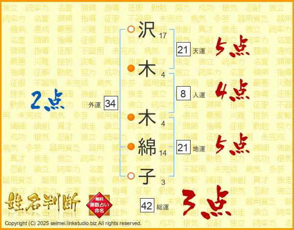 沢(17画)木(4画)  木(4画)綿(14画)子(3画)