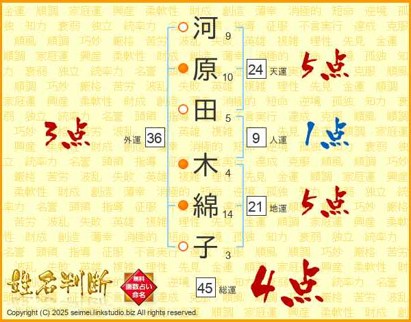 河(9画)原(10画)田(5画) 木(4画)綿(14画)子(3画)