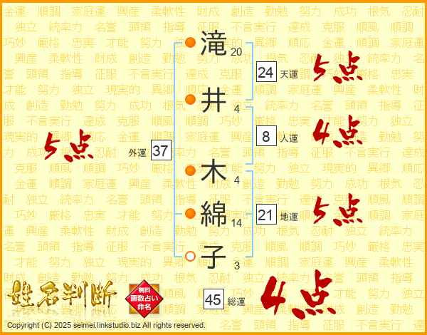 滝(20画)井(4画) 木(4画)綿(14画)子(3画)