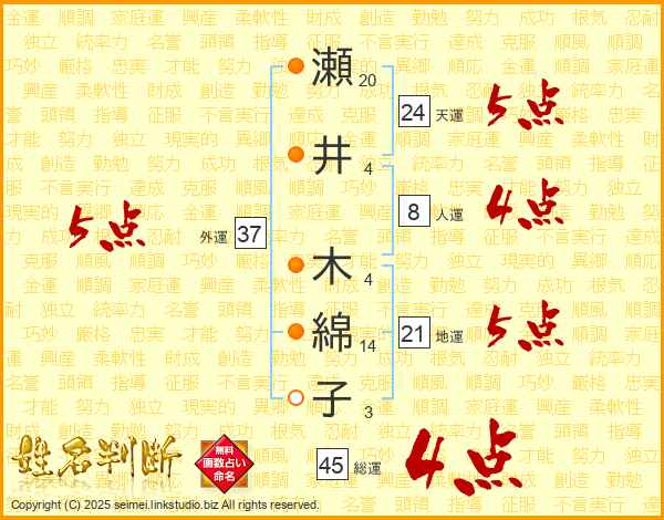 瀬井木綿子さんの外運は37画の5点!