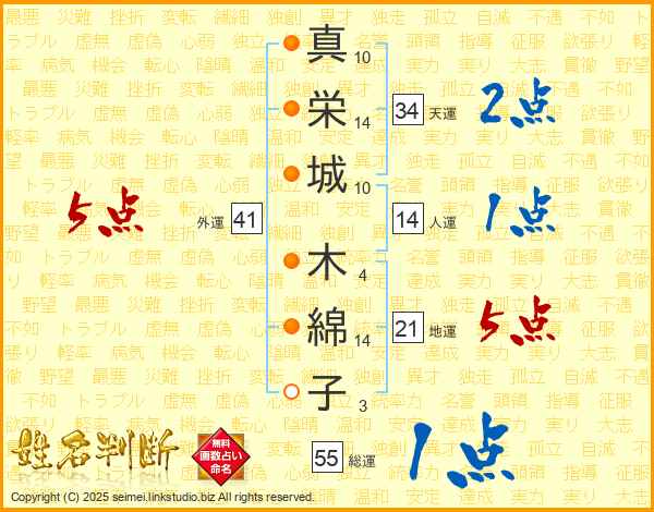 真(10画)栄(14画)城(10画) 木(4画)綿(14画)子(3画)
