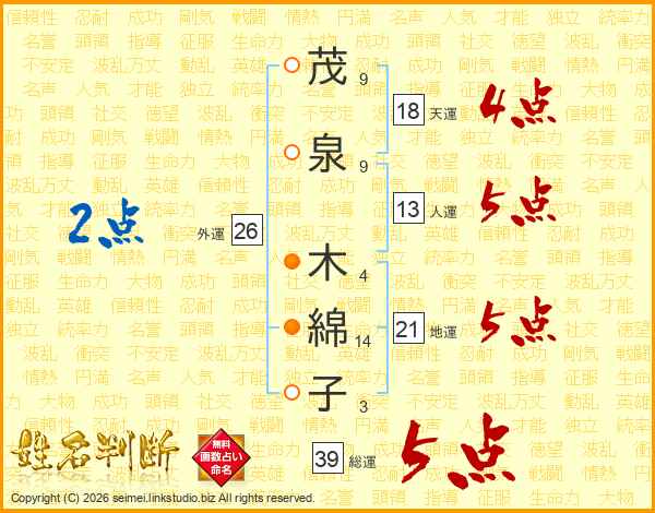 茂(9画)泉(9画) 木(4画)綿(14画)子(3画)
