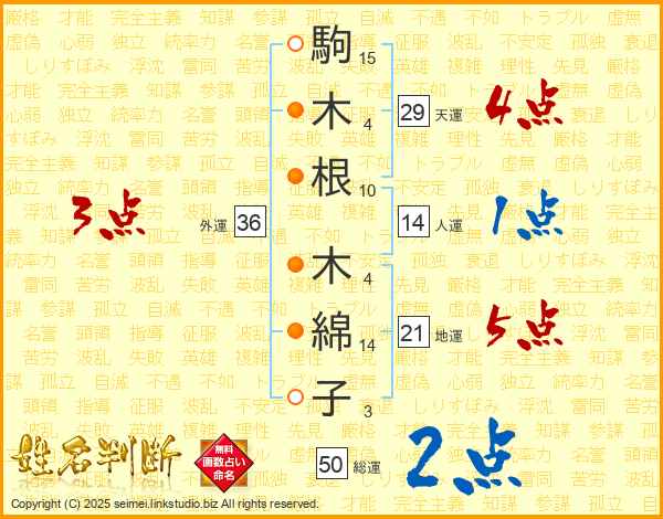駒(15画)木(4画)根(10画) 木(4画)綿(14画)子(3画)