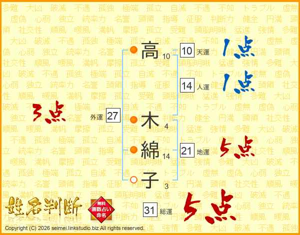 あなたの人生を表す1番重要な運勢です。生涯を通じて影響する総合運となり、主に50歳以降の晩年期に影響を及ぼします。苗字と名前の合計画数。