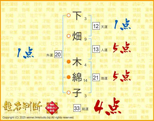 下畑木綿子さんの総運は33画の4点!