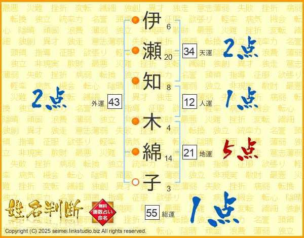 伊(6画)瀬(20画)知(8画) 木(4画)綿(14画)子(3画)