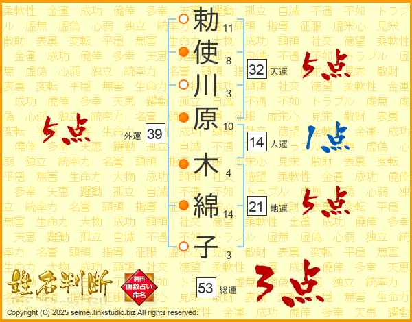 勅(11画)使(8画)川(3画)原(10画) 木(4画)綿(14画)子(3画)