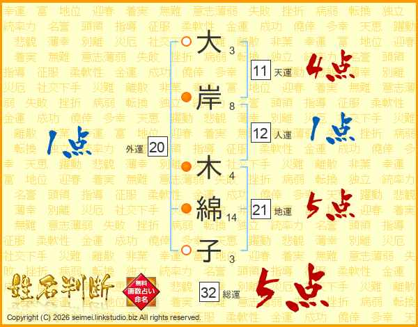大岸木綿子さんの総運は32画の5点!