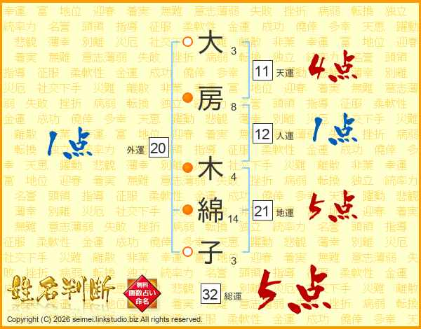 大房木綿子さんの総運は32画の5点!