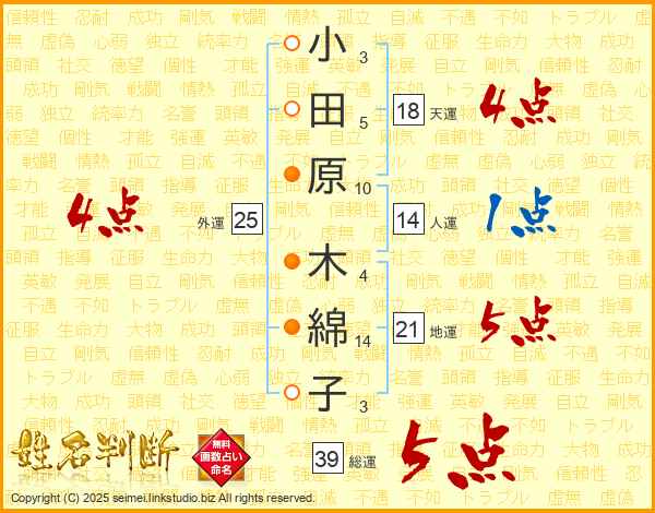 小田原木綿子さんの総運は39画の5点!