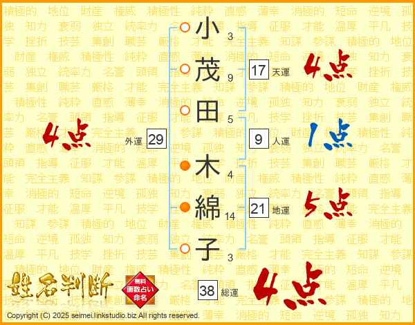 小(3画)茂(9画)田(5画) 木(4画)綿(14画)子(3画)