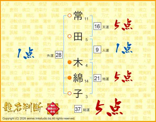 常(11画)田(5画) 木(4画)綿(14画)子(3画)