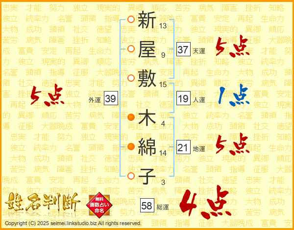 新(13画)屋(9画)敷(15画) 木(4画)綿(14画)子(3画)