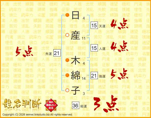 日(4画)産(11画) 木(4画)綿(14画)子(3画)