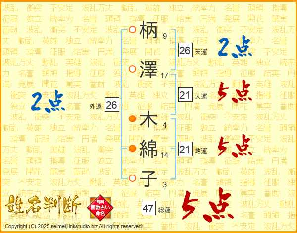 柄(9画)澤(17画) 木(4画)綿(14画)子(3画)