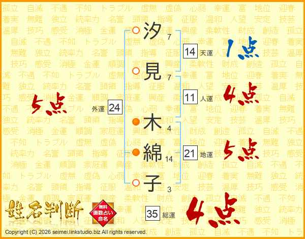 汐(7画)見(7画) 木(4画)綿(14画)子(3画)