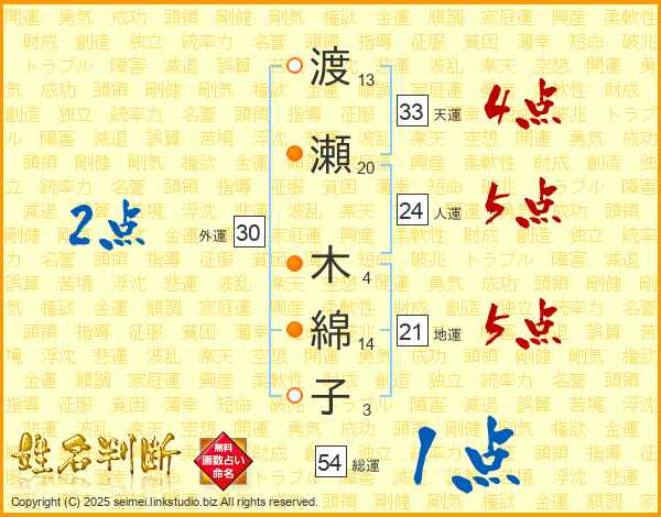 渡瀬木綿子さんの総運は54画の1点!