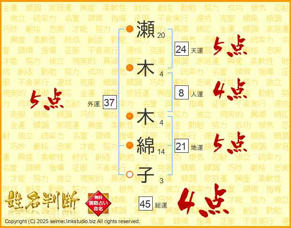 瀬(20画)木(4画) 木(4画)綿(14画)子(3画)