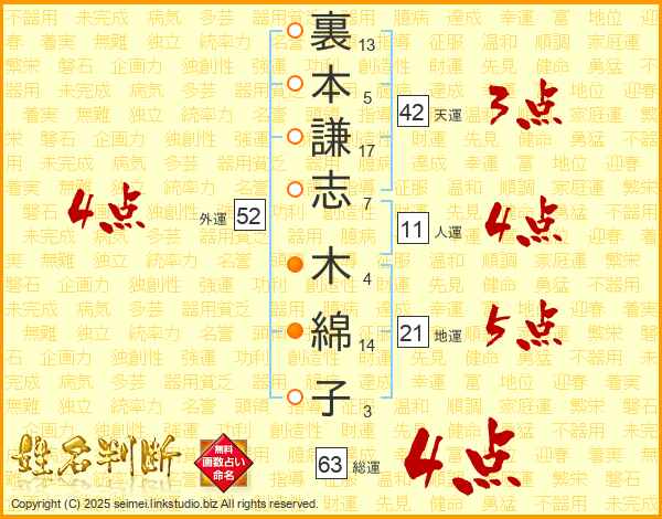 裏(13画)本(5画)謙(17画)志(7画) 木(4画)綿(14画)子(3画)
