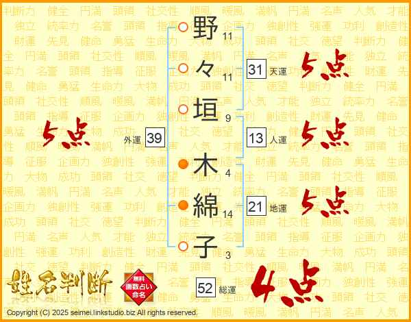野(11画)々(11画)垣(9画) 木(4画)綿(14画)子(3画)