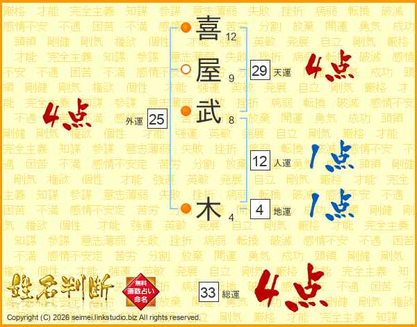 喜(12画)屋(9画)武(8画) 木(4画)