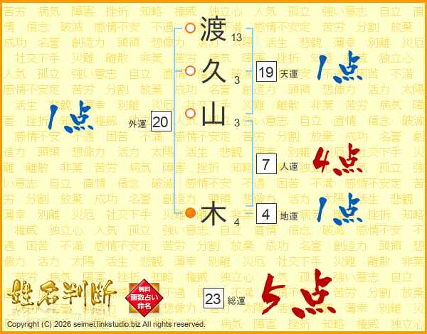 生活面を象徴する運勢です。外部から受ける影響力を表し、結婚運、家庭運や職場、環境への順応性を表します。総運から人運を引いた画数。姓や名が1文字の場合を除く。