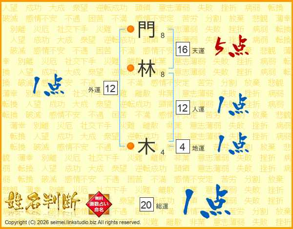 生活面を象徴する運勢です。外部から受ける影響力を表し、結婚運、家庭運や職場、環境への順応性を表します。総運から人運を引いた画数。姓や名が1文字の場合を除く。