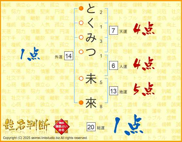 生活面を象徴する運勢です。外部から受ける影響力を表し、結婚運、家庭運や職場、環境への順応性を表します。総運から人運を引いた画数。姓や名が1文字の場合を除く。