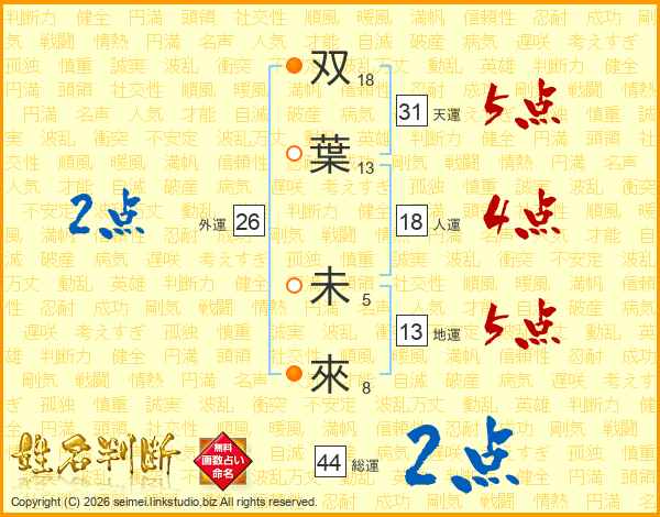 あなたの人生を表す1番重要な運勢です。生涯を通じて影響する総合運となり、主に50歳以降の晩年期に影響を及ぼします。苗字と名前の合計画数。