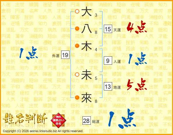 大(3画)八(8画)木(4画) 未(5画)來(8画)