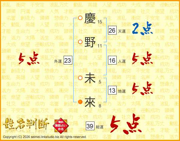 生活面を象徴する運勢です。外部から受ける影響力を表し、結婚運、家庭運や職場、環境への順応性を表します。総運から人運を引いた画数。姓や名が1文字の場合を除く。
