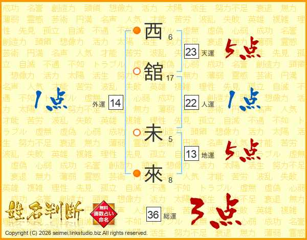 生活面を象徴する運勢です。外部から受ける影響力を表し、結婚運、家庭運や職場、環境への順応性を表します。総運から人運を引いた画数。姓や名が1文字の場合を除く。
