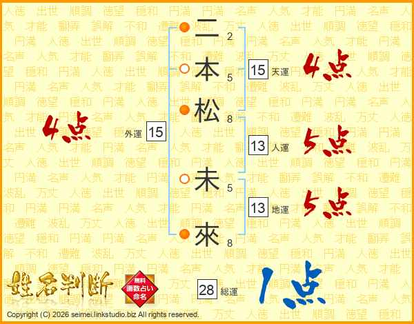 二(2画)本(5画)松(8画) 未(5画)來(8画)