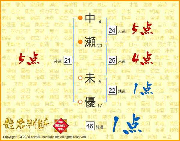 生活面を象徴する運勢です。外部から受ける影響力を表し、結婚運、家庭運や職場、環境への順応性を表します。総運から人運を引いた画数。姓や名が1文字の場合を除く。